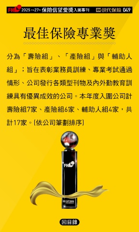 2025 27 ڭᎈڦૐฌᆤ ɝఖਖ਼̊ 049 the th 最佳保險專業獎 分為「壽險組」、「產險組」與「輔助人 組」;旨在表彰業務員訓練、專業考試通過 情形、公司發行各類型刊物及內外勤教育訓 練具有優異成效的公司。本年度入圍公司計 壽險組7家、產險組6家、輔助人組4家,共 計17家。(依公司筆劃排序) Ϋͦ