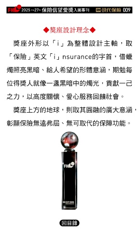 2025 27 ڭᎈڦૐฌᆤ ɝఖਖ਼̊ 009 the th ◆獎座設計理念◆ 獎座外形以「i」為整體設計主軸,取 「保險」英文「i」nsurance的字首,借蠟 燭照亮黑暗、給人希望的形體意涵,期勉每 位得獎人就像一盞黑暗中的燭光,貢獻一己 之力,以高度關懷、愛心服務回饋社會。 獎座上方的地球,則取其圓融的廣大意涵, 彰顯保險無遠弗屆、無可取代的保障功能。 Ϋͦ
