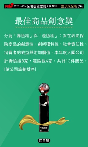 2025 27 ڭᎈڦૐฌᆤ ɝఖਖ਼̊ 094 the th 最佳商品創意獎 分為「壽險組」與「產險組」;旨在表彰保 險商品的創意性、創新獨特性、社會責任性、 消費者的效益與附加價值。本年度入圍公司 計壽險組8家,產險組4家,共計13件商品。 (依公司筆劃排序) Ϋͦ